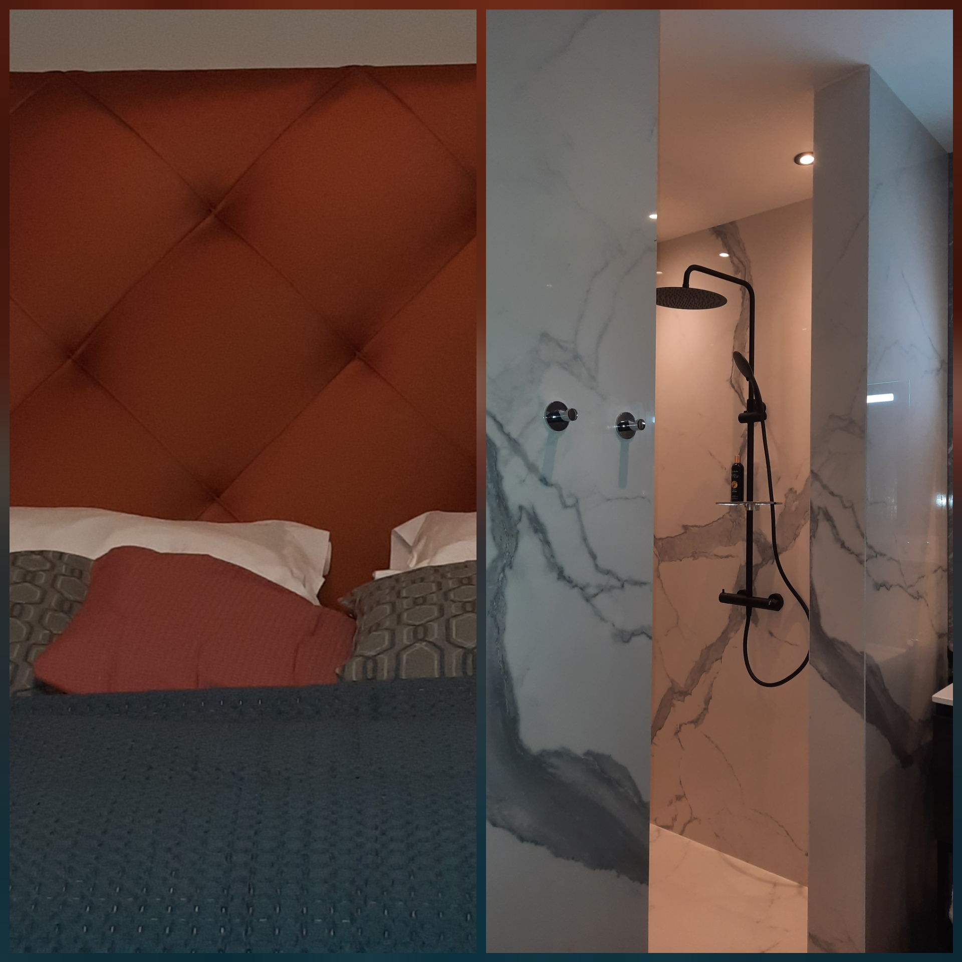 De oranje kamer beschikt over een open badkamer met dubbele regendouche en dubbele wastafel. Voor een comfortabele en goede nachtrust beschikt de Oranje kamer over een luxueuze Treca Paris boxspring 180×200. Een tafel waar je aan kunt ontbijten en/of aan te werken. Deze kamer is ideaal voor singles of koppels die op zoek zijn naar een comfortabele kamer. Kamerprijs vanaf €125,- per nacht. (Ex toeristenbelasting) afhankelijk van het seizoen.